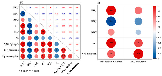 The correlation between soil variables and the gas emission characteristics of BS amended soils under different application frequencies is shown in Figure 6A. Soil NH4+ and pH were strong positive predictors of cumulative N2O emissions, CO2 emissions, N2O/(N2O + N2), and O2 consumption (p < 0.05). While these gas emissions were negatively correlated with soil NO3− content (p < 0.01). The emission characteristics of N2 and CO2 were significantly associated with soil DOC content (p < 0.05; Figure 6A), where N2 emissions exhibited a negative correlation with DOC content, while CO2 emissions showed a positive correlation with DOC content.
