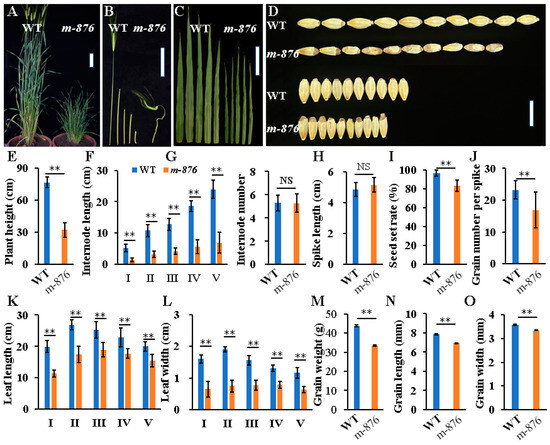 The morphology of Yangnongpi 5 (WT) and the m-876 mutant. (A) Plant morphology of the WT and m-876 at the heading stage. Scale bar = 10 cm. (B) The 1st–5th internodes of the WT and the m-876 mutant at the heading stage. Bars = 10 cm. (C) The 1st–5th leaves of the WT and the m-876 mutant at the heading stage. Scale bar = 5 cm. (D) The morphology of mature grains from WT and m-876 plants. Scale bar = 1 cm. (E) Plant height. (F) Internode length. (G) Internode number. (H) Spike length. (I) Seed set rate. (J) Grain number per spike. (K) Leaf length. (L) Leaf width. (M) Thousand-grain weight. (N) Grain length. (O) Grain width. ** Significant difference at p < 0.01 as compared to WT using Student’s t-test, NS indicates no significant difference.
