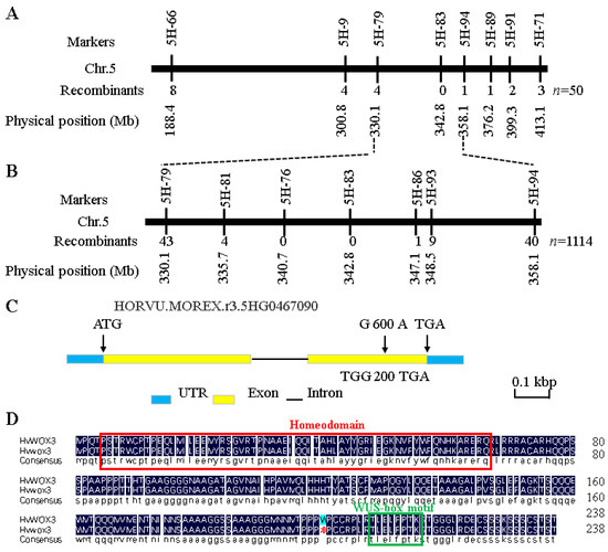 3.2. Genetic Analysis and Map-Based Cloning of HvWOX3A