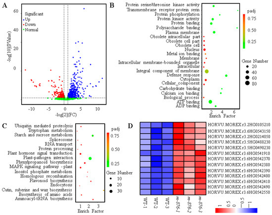 The transcriptome analysis revealed multiple signaling pathways changed by the HvWOX3A gene. (A) Volcano plot representing the differentially expressed genes in the m-876 mutant. The x-axis exhibits the significance scores, and the y-axis shows the expression fold-changes of the DGEs. The blue and red dots represent the up- and downregulated genes, respectively. (B) The gene ontology (GO) categories of the DGEs. (C) Kyoto Encyclopedia of Genes and Genomes (KEGG) categories of the DGEs. (D) A heatmap showing the expression levels of the KAO and WAK gene members in barley. The colors represent high (red) and low (blue) expression levels in terms of fragments per kilobase of exon per million mapped fragments (FPKM) values for each gene.