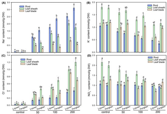 - Wang, B.S.; Zou, Q.; Zhao, K.F. Effect of NaCl stress on ionic contents in different organs of sorghum plants. Acta Agron. Sin. 2000, 26, 845–850. [Google Scholar]