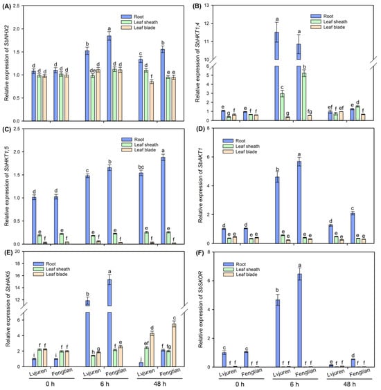3.6. The Expressions of Genes Related to Na+ and K+ Transport in Sweet Sorghum under NaCl Treatment