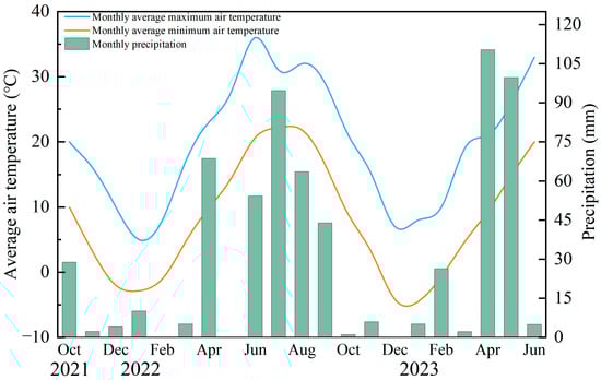 Weather data during 2021−2022 and 2022−2023 wheat growing seasons. The figure shows monthly average maximum and minimum air temperature (°C) and monthly precipitation (mm).