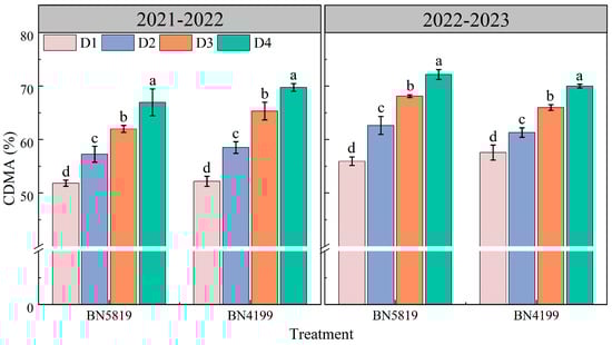 The contribution rate of dry matter accumulation to the grain (CDMA) after anthesis at different varieties and planting densities during wheat maturation in 2021–2023. D1, D2, D3, and D4, respectively, indicated that the planting density of wheat was 90 × 104 plants/ha, 180 × 104 plants/ha, 270 × 104 plants/ha, and 360 × 104 plants/ha. Error bars are standard errors. Values within a column followed by different letters are significantly different among different treatments (p < 0.05).