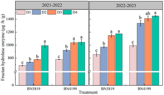 In 2021–2023, the activity of fructan hydrolase in wheat stems under different varieties and planting density treatments at anthesis stage. D1, D2, D3, and D4, respectively, indicated that the planting density of wheat was 90 × 104 plants/ha, 180 × 104 plants/ha, 270 × 104 plants/ha, and 360 × 104 plants/ha. The same row of different lowercase letters indicates that there were significant differences between the same variety and different planting density treatments at anthesis stage (p < 0.05). Error bars are standard errors.