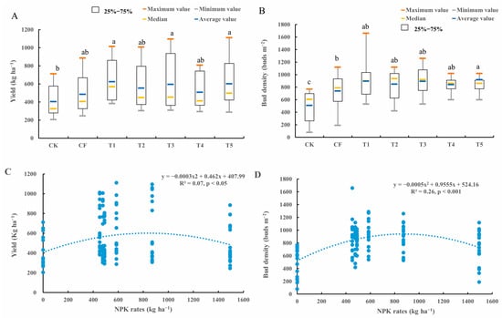 Changes in tea yield (A,C) and bud density (B,D) in response to different fertilisation regimes from 2019 to 2021. Box plots (A,B) show the ANOVA results of the yield and bud density under different fertilisation regimes. Values shown are the means ± SD (n = 18), and lowercase letters in the same column represent significant differences among treatments at a significance level of p < 0.05. Regression analysis displays the correlation of the tea yield (C) and bud density (D) with the NPK rates (n = 126). CK, no fertiliser; CF, conventional fertiliser; T1, tea-specific formula fertiliser; T2, T1 + acidification amendment; T3, organic substitution based on T1; T4, urea formaldehyde slow-release fertiliser; T5, carbon-based organic fertiliser.