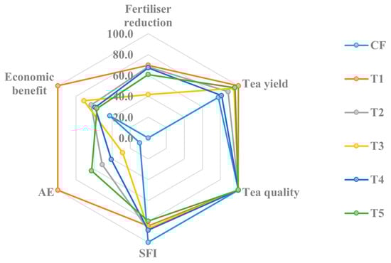 CK, no fertiliser; CF, conventional fertiliser; T1, tea-specific formula fertiliser; T2, T1 + acidification amendment; T3, organic substitution based on T1; T4, urea formaldehyde slow-release fertiliser; T5, carbon-based organic fertiliser. The radar map was based on the normalised percentage of the fertiliser reduction ratio, tea yield, tea quality, SFI, AE and economic benefits. Among the above parameters, the SFI was the result of 2020; AE was the average result of 2019 and 2020 and tea yield, tea quality and economic benefit were the average results of 2019–2021.
