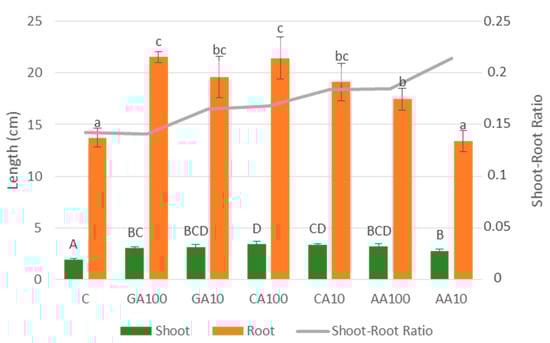 Mean values of shoot length, root length, shoot–root ratio of cucumber seedlings treated with different silver nanopriming solutions (silver nanoparticles were synthetized by Gallic acid (GA), Caffeic acid (CA), and Ascorbic acid (AA) and 10 mM and 100 μM AgNO3). Different letters denote significant differences between treatments based on Duncan’s multiple range test (p < 0.05).