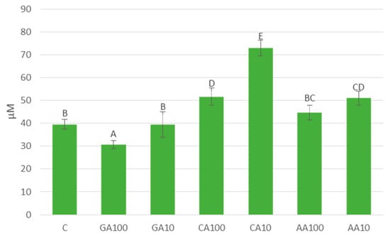The content of free amino acids, crucial indicators of cellular metabolism, also varies significantly among treatments (Figure 10). The water-control treatment exhibits the highest content of free amino acids (56.71 mg/g FW), followed by treatments GA10 and CA10. Conversely, the lowest levels are observed in treatment CA100. Treatments GA100, AA100, and AA10 display intermediate levels of free amino acids.