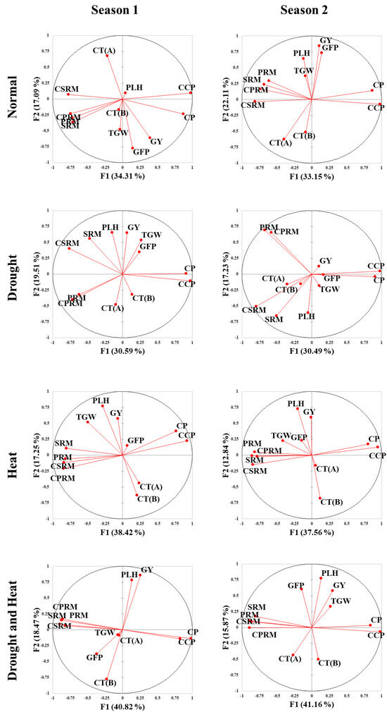 The results indicated that GFP was positively correlated with GY in both years. A negative relationship was observed between CT(A) and CT(B) with GY in both years (Figure 1). There was a positive correlation among CPRM, SRM, and PRM. The biplots clearly show a strong positive association between SRM and TGW under drought-stress conditions. In addition, PRM, CPRM, and GY are strongly correlated in both normal and drought stress conditions. Notably, SRM, PRM, CPRM, and CSRM are strongly associated with GY under heat stress and combined heat and drought stress conditions. In all seasons and growth conditions, a strong association was observed between CCP and GY, except in the second season under normal conditions.