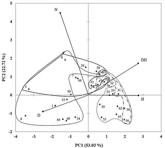 As shown in Figure 1, the first two PCs explained approximately 51.4% and 55.26% of the total variation under N1 and N2 trials, respectively. The association of traits in each trial is illustrated in the PCA loading plot. Angles among vectors represent the magnitude and direction of corresponding correlations. Acute angles (<90°) represent a positive correlation, while wide obtuse angles (>90°) show a negative correlation. The cosine of angles determines the magnitude of the correlation. Additionally, the length of the vectors shows the extent of variability.