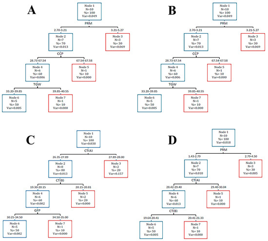 Regression tree of yield components of the top 10 genotypes: (A): normal, (B): drought stress, (C): heat stress, and (D): combined heat and drought stress. The ordinal CHAID algorithm was used for analysis. Each rectangle represents its respective branch node. The attribute value interval is shown above the associated node. The node number, the percentage of genotypes located in each branch, and the variance of the corresponding traits are shown inside each node. Trait abbreviations are the same as in Table 1.