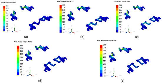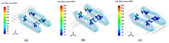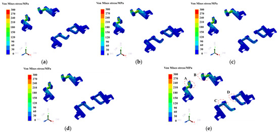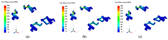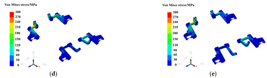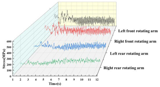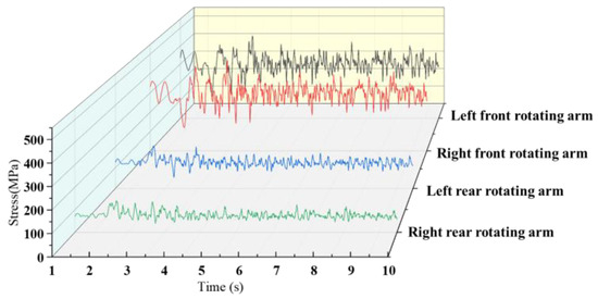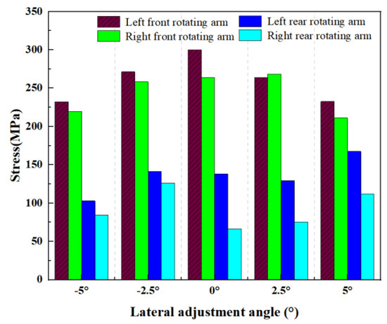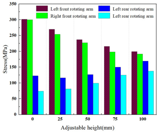 - Under different adjustment conditions, the maximum stress position was consistently distributed in the same area of the left-front rotating arm and the left-rear rotating arm. Each mechanism’s maximum dynamic stress satisfied the yield strength of the material.