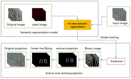 Figure 1. The visual navigation line detection of rape crop rows proposed in this study consists of two parts: image semantic segmentation and navigation line extraction. The crop row pixel features were extracted from the camera-captured rape images based on the proposed VC-UNet model. The end-to-end vertical projection algorithm was used for the prediction of the results to locate the crop rows for extraction to the navigation line, and the final result was then returned for the projection of the results to the original image.
