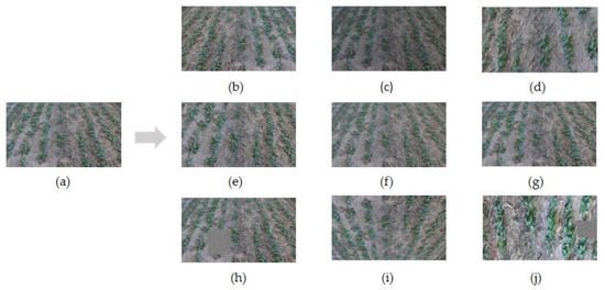 The objective of data augmentation in the context of oilseed rape crop row image data is to increase the amount of new data, thereby enhancing the robustness and generalization ability of the model, mitigating overfitting, and circumventing the issue of sample imbalance. To expand the dataset and increase the diversity of the oilseed rape dataset, a series of image processing techniques were applied to the images, as shown in