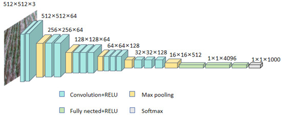 Figure 5. The structure of the neural network is simplified by replacing the VGG16 model in the main feature extraction network part, thereby accelerating the convergence speed of the model and reducing the training time. The maximum pooling layer in the fifth convolution of the model, the fully connected layer and the maximum pooling structure in the model, were removed by cropping. The cropped model was constructed from 13 convolutional layers with convolutional kernels of size 3 × 3, step size 1, and fill pixel 1, and four maximal pooling layers of size 2 × 2, step size 2, and fill pixel 1, as well as the ReLU activation function. The VGG16 model employs small convolutional kernels of identical size to encourage parameter sharing, thereby reducing parameter count. The incorporation of scale dithering as a pre-training model has been shown to facilitate the acceleration of training and enhance the accuracy of the model, when compared to the original U-Net model.