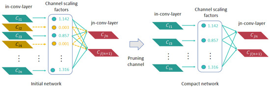 Figure 7, the scaling factors in the BN layer were linked to the channel number during the pruning process. Subsequently, sparse regularization was applied to these factors to automatically eliminate unimportant channels. The channels with smaller scaling factors were located on the left side (yellow), and following pruning, only those with larger scaling factors remained (green), resulting in a more compact network model on the right side. Finally, the model underwent fine-tuning to preserve the properties of the original network architecture, ensuring proper training with a slight increase in accuracy.