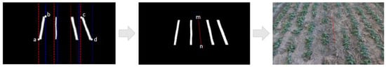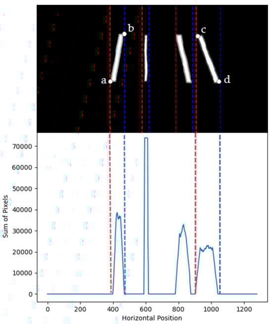 The vertical projection peaks correspond to the cropping rows, which are numbered from left to right. The left endpoints and right endpoints of the first and fourth cropping rows were recorded in the detection and labeled as the four feature points a, b, c, and d in the order of detection, as shown in