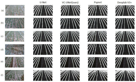 In response to the soil topography factor, the oilseed rape dataset has striped crop ridges, a trait that is more prominent in the images. This trait interferes with crop row identification in oilseed rape, in particular, for vertical crop ridges, where some oilseed rape crop rows are planted very close to them. The trained segmentation results effectively exclude the unfavorable factors due to the presence of ridges in the soil.