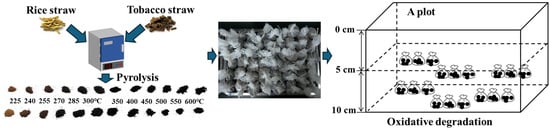 Both tobacco and rice straw were collected from the experimental fields of Hunan Agricultural University, Changsha, Hunan, China (the same variety and experimental field). The collected straw was cleaned and dried, then cut into small sections of about 5 cm and dried in an oven (60 °C). Finally, it was crushed using a hammer pulverizer (KFJ-20, Zhejiang Ruihao Machinery Manufacturing Co., Ltd., Wenzhou, China) and passed through a 1 mm sieve before being stored for future use. The properties of tobacco and rice straw biochar are shown in Table S1.