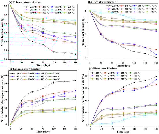 Figure 2 shows the dynamic changes in the biochar masses and degradation rates of two kinds of straw over time. The results showed that the degradation rate of straw biochar decreased with an increase in the carbonization temperature, and the mass of straw biochar decreased with an increase in the decomposition rate over time. The degradation of the straw biochar mainly occurred in the first 30 days, and the subsequent degradation rate gradually slowed down. In addition, the degradation rate of straw biochar prepared before 300 °C was relatively faster than that prepared at 300 °C, indicating that 300 °C is an important turning point for the stability change of straw biochar. The mass of tobacco straw biochar prepared before 300 °C and after 300 °C decreased by 1.52~2.70 g and 0.83~1.06 g, respectively, after 180 days, and the decomposition rate reached 30.47~54.00% and 16.53~21.13%, respectively. Similarly, the mass of rice straw biochar prepared before 300 °C and after 300 °C decreased by 1.60~3.98 g and 0.87~1.19 g, respectively, after 180 days, while the decomposition rate reached 31.93~79.53% and 17.47~23.73%, respectively.