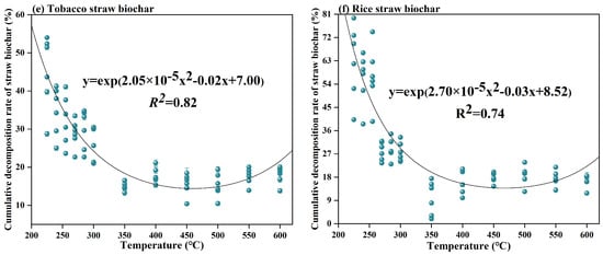 The results showed that the biochar prepared before 300 °C was more easily degraded, and the degradation effect of rice straw biochar was better. The change in the pyrolysis temperature affected the change in the characteristics of straw biochar []. The unstable substances in straw biochar generated by low-temperature pyrolysis, such as hydrogen, oxygen, and K, were not completely lost, and these unstable substances were more easily decomposed under anaerobic soil conditions []. In addition, the straw biochar produced before 300 °C still existed in the cellulose and hemicellulose. The cellulose and hemicellulose, the main components of straw [], served as nutritional sources for soil microbes. With increasing microbial metabolic activity, the decomposition of straw biochar also accelerated []. The straw biochar prepared after 300 °C formed a more stable aromatic structure, which was not easily decomposed in the soil but could be used as a habitat for microorganisms. In addition, there was a strong exponential relationship between the decomposition rate of the two types of biochar and the pyrolysis temperature (R2 = 0.82 and R2 = 0.74; Figure 2e,f), indicating that pyrolysis temperature is an important factor affecting biochar degradation.