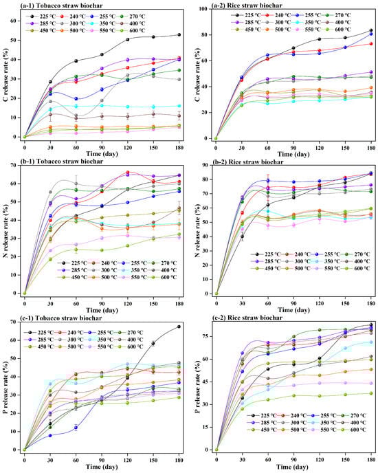According to the rate of C release from the straw biochar (Figure 3(a-1,a-2)), the release of C at different temperatures can be divided into the fast-release period (0~30 days) and the slow-release period (30~180 days), especially for straw biochar produced after 300 °C. Throughout the whole degradation period, the cumulative C release rate of tobacco straw biochar was 5.02~52.86%, while the release from rice straw biochar was 32.03~83.55%, indicating that rice straw biochar is easier to decompose, mainly because of the difference in C contents and the structures of the two kinds of straw biochar (Table S2). The lower the pyrolysis temperature, the greater the amount of C that was released from the straw biochar. Tobacco straw is mainly composed of plant cell walls, and the decomposition rate of its components is generally hemicellulose, cellulose, and lignin in turn; of course, there is also a small amount of easily decomposed proteins and water-soluble substances []. Due to the covalent binding of hemicellulose and lignin in the straw and the cellulose being wrapped by hemicellulose and lignin [], during the pyrolysis process, it is difficult for hemicellulose, cellulose, and lignin to be completely degraded. It is also easier to form a stable C structure, so the nutrients are not easily released. With an increase in temperature, the hemicellulose and cellulose in straw undergo dehydration, decarboxylation, and decarbonylation reactions [], and the remaining structure is rearranged to form a more stable aromatization structure; thus, less C is released. The application of biochar improved the C cycle of soil and the photosynthesis process of crops, affecting the carbohydrate synthesis and dry matter distribution process []. For example, Nan et al. found that the application of biochar promoted the uptake and utilization of CO2 and dry matter accumulation by crops by altering the C cycle process []. In addition, biochar contains organic C that can be absorbed by crops, which is conducive to the improvement of their own yield after absorption and utilization []. Therefore, the release of C from biochar is essential for the growth of crops.