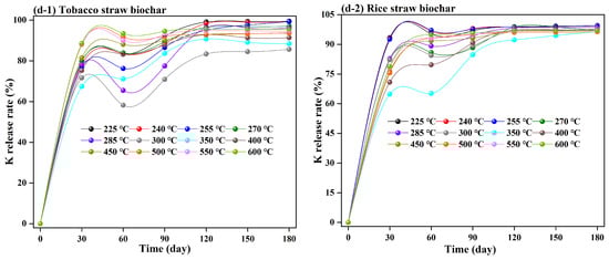 Figure 3(d-1,d-2) shows the release pattern of K in straw biochar. The release of K in the two types of straw biochar showed two stages: rapid release (0~30 days) and slow release (30~180 days), with a slight decrease on the 60th day and a gradual slow release after 60 days. The K release rates of two types of straw biochar were as high as 85.67% to 99.97% and 96.48% to 99.47% in the first 30 days, indicating that the K in the straw biochar had been released. By the end of cultivation, the K had been completely released, further indicating that straw biochar could be used as a source of K in the early stage of crop growth. In addition, the K in straw biochar mainly existed in the form of ions and was easily soluble in water [,]; therefore, the release rate of K was the fastest. In addition, the K content in straw biochar was relatively high, resulting in more release. As the temperature increased, the cumulative release rate of K also gradually increased. This is because the K content in straw biochar was positively correlated with the pyrolysis temperature []. The higher the temperature, the higher the K content, leading to an increase in the amount released.