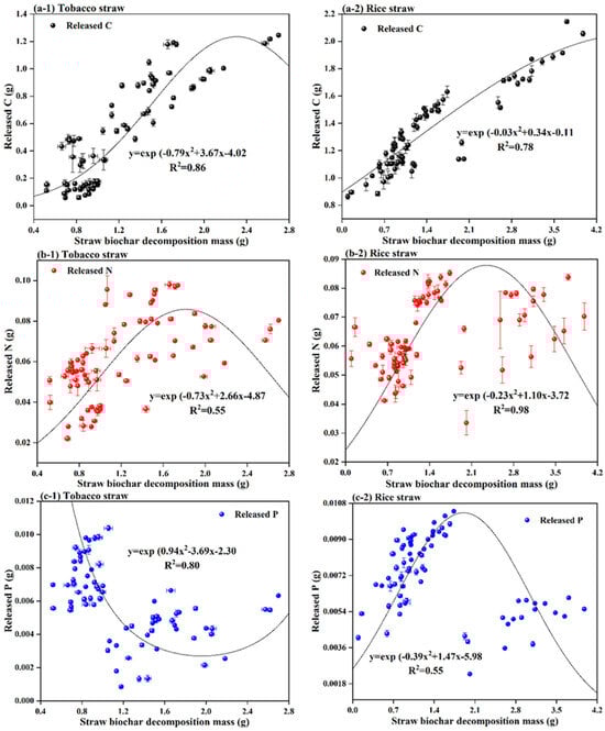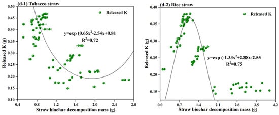 The release of C from the two types of straw biochar was exponentially correlated with the degradation quality of straw biochar (R2 = 0.86 and R2 = 0.78; Figure 4(a-1,a-2)), indicating that the released C exponentially decreased from the straw biochar as the decomposition mass of straw biochar decreased. This is because the unstable C components in straw biochar were progressively released over time. In addition, as the temperature increased, the hemicellulose and cellulose in the straw biochar gradually underwent dehydration, decarboxylation, and decarboxylation reactions [], forming a more stable aromatic structure and making it less likely for C to be released. In addition, the release of C from straw biochar was mainly concentrated in its early degradation stage, especially in rice straw biochar. The higher the degradation, the more C was released. As seen in Figure 4(b-2), the released N from the rice straw biochar had a significant exponential function relationship with its degradation (R2 = 0.98), indicating that N was more easily released from the rice straw biochar. Similarly, the released P exponentially decreased as the decomposition mass from tobacco straw biochar (Figure 4(c-1); R2 = 0.80). However, the exponential relationship between released N and decomposition mass was not strong from tobacco straw biochar produced at different pyrolysis temperatures. Also, the released P from rice straw biochar and the released K from tobacco and rice straw biochar showed a weak exponential relationship with decomposition mass. The released C, N, P, and K in the straw biochar and decomposition mass represent exponential decay models. The N, P, and K were gradually released in the early stages of straw degradation, with less being released in the later stages. This is because the unstable part of straw biochar was preferentially decomposed by microorganisms in the soil []. In addition, the degradation of straw biochar was accompanied by the release of its nutrients, indicating a certain relationship between the various nutrients in straw biochar. The interrelationships between nutrients will further affect the decomposition process of straw, thus, it is necessary to further analyze the relationships between the various nutrients released from straw biochar.