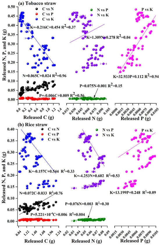 In addition to the effect of different pyrolysis temperatures on the release of nutrients from straw biochar, the C, N, P, and K released during the degradation process also affected each other. The correlation analysis between the released C and N and P and K from tobacco straw biochar and rice straw biochar is shown in Figure 5a,b. For tobacco straw biochar (Figure 5a), there was a significant positive linear correlation between the released C and N (R2 = 0.96) and P and K (R2 = 0.94) from tobacco straw biochar, indicating that the C and N and P and K in tobacco straw biochar shared the same pathway during the release process. There was also a synergistic effect between C and N, P, and K. Previous studies have also shown that the input of straw or straw biochar can regulate the C/N ratio of the soil [], thereby affecting C and N cycling. Generally, the appropriate C/N ratio in the soil is suitable for the growth of microorganisms [], while in this study, the C and N in the straw biochar were released synchronously, indicating that the metabolism of the microorganisms in the soil was not limited by C or N. The release of P and K from the straw biochar was also positively correlated, indicating that their degradation was uniform before 180 days; these research results were similar to those of []. In addition, there was a negative correlation between C, P, and K, indicating that the released C from the straw biochar was limited by P and K. The degradation of C occurred throughout the entire cultivation period, while the release of P and K was relatively fast. This further indicated that the application of straw biochar could serve as a beneficial source of P and K to soil microorganisms in the short term and as a source of C and N in the long term. Of course, the nutrient elements in biochar are limited, and some fertilizers need to be added appropriately to provide nutrients in the process of crop planting. The interaction between the N, P, and K released from the straw biochar was not significant, indicating that these nutrients were less affected by each other. For the rice straw biochar, except for a negative correlation between N and K, the interaction relationship between other nutrients was similar to that of tobacco straw biochar. The N in rice straw biochar was not affected by the pyrolysis temperature and seemed unaffected by different nutrients. In addition, the R2 of various nutrients released from the tobacco biochar was higher than that in rice straw biochar, which means that the nutrient release from the tobacco biochar showed a higher correlation effect.