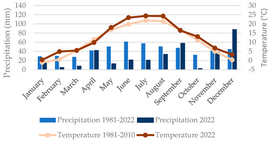 Monthly precipitation and mean monthly temperature in the experimental year 2022 and 1981–2010 in Szarvas.