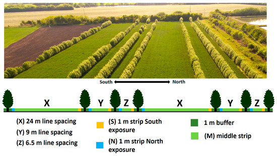 Photo and layout of the experimental site. Line spacing means the distance between the tree lines (X, Y, Z).The 1 m strip with north exposure, 1 m strip with south exposure, and middle strip arerefer to the orientation. The 1 m buffer is the zone between the tree lines and the red clover area.