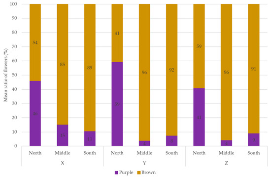 The total number of flowers per plant was significantly influenced by orientation, line spacing, and their interaction (Table 1). The mean flower counts were 6.6 ± 4.6 for line X, 7.8 ± 5.2 for line Y, and 8.5 ± 4.9 for line Z. The lowest flower count was observed on the north side, and the highest in the middle strip across all line spacings. In the southern strip, line X had significantly fewer flowers than lines Y and Z (Table 2). Flower maturity varied significantly with orientation, with a higher proportion of purple (immature) flowers on the north side, indicating earlier developmental stages (Figure 3). This is supported by the correlation between SPAD values and number of purple/brown/total flowers, as chlorophyll content depends on the flowering stage (Table 3). According to Saadat et al. [33], the differences in SPAD values in red clover could be attributed to the plants flowering at different times.