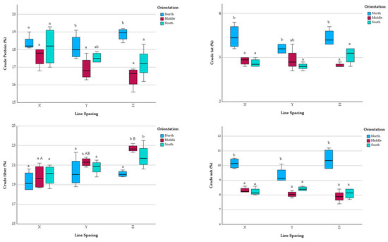 The crude fat content ranged from 2.7% to 3.8%. No significant differences were found between the line spacings (X: 3.1 ± 0.3%; Y: 3.0 ± 0.2%; Z: 3.1 ± 0.3%). Orientation had a significant effect, with the north side showing the highest mean value (X: 3.5 ± 0.3%; Y: 3.2 ± 0.1%; Z: 3.5 ± 0.2%), while no significant differences were observed between the middle and south sides (Figure 4).