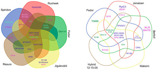 Overlap in markers between the top accessions among the global sample pool (left) and among the varieties of Kazakhstan’s origin (right). The titles of markers conferring resistance to viruses are highlighted in blue, those conferring resistance to fungi in pink, and those conferring resistance to nematodes in green. The additional coloring of leaves is intended to differentiate the potato accessions.