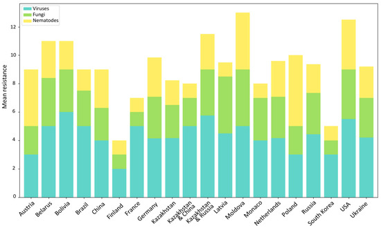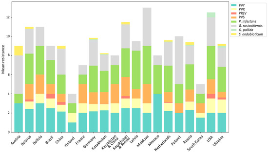 Overview of resistance (resistant loci) common in studied potato varieties from different countries. Mean resistance was calculated as the sum of total positives for all markers specific to a pathogen or pests divided by the number of potato varieties per country.