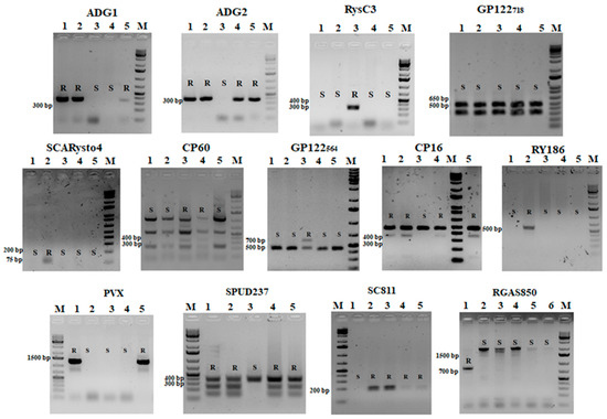 The results of amplification and restriction for markers associated with resistance to viruses. R—resistant, S—susceptible. ADG1 marker: 1—Resurs, 2—Rannyaya Roza, 3—Rusalka, 4—69-3, 5—Bipt. ADG2 marker: 1—20-97-16, 2—Monte Carlo, 3—Nartau, 4—K24-747, 5—52-3-1. RysC3 marker: 1—Rusalka, 2—Alyi parus, 3—Il’in, 4—17-212-34, 5—Grandia. GP122718 marker: 1—Valentina, 2—S. andigenum, 3—Tyan’shanskii, 4—Yagodnyi-19, 5—Kainar. SCARysto4 marker: 1—Anosta, 2—Buran, 3—Gloriya, 4—Simfoniya, 5—Bipt. CP60 marker: 1—Soyuz, 2—Azanda, 3—Pamyati Bobrova, 4—Etyud, 5—Akzhar.GP122564 marker: 1—Kormilitsa, 2—Stobrawa, 3—Portland grana, 4—VIR-92, 5—Bars. CP16 marker: 1—Merli, 2—Valentina, 3—S. andigenum, 4—Tyan’shanskii, 5—Yagodnyi-19. Ry186 marker: 1—Spiridon, 2—Koktem 1, 3—14-07-04, 4—Tyan’shanskii, 5—P1 32. PVX marker: 1—Jigulevskii, 2—Meteor N, 3—K 24722, 4—Fioretta, 5—Il’inskii. SPUD237 marker: 1—23-10-07, 2—11-98-3, 3—9-10-05, 4—K-20422, 5—KG-1. SC811 marker: 1—17-225-11, 2—217-250-12, 3—17-112, 4—Miras, 5—17-225-12. RGASC850 marker: 1—Dina, 2—Anosta, 3—Buran, 4—Gloriya, 5—Simfoniya, 6—Bipt. M—1 kb plus DNA ladder (Invitrogen).