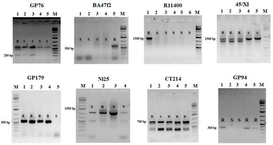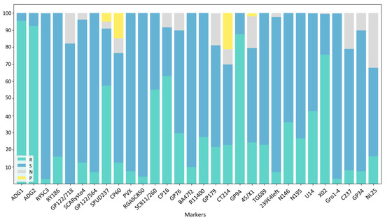 The percentage of positive results relative to all markers used. R—resistant, S—susceptible, N—not identified, P—polymorphic.
