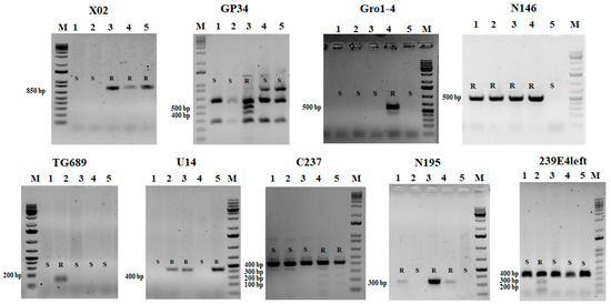 PCR and restriction products obtained using DNA markers associated with resistance to nematodes. R—resistant, S—susceptible. X02 marker: 1—Vid-2, 2—17-212-7, 3—Osen’, 4—Ts-6, 5—Prilugskii. GP34 marker: 1—Kogaly, 2—Montana, 3—Osennii, 4—Tyumen’skii, 5—Lyubava. Gro1-4 marker: 1—Quarte, 2—Edem, 3—Astana, 4—Jivica, 5—Pamyati Bobrova. N146 marker: 1—Roko, 2—Marfona, 3—Lada, 4—Fazan, 5—VIR 1(15n1898). TG689 marker: 1—21-16-03, 2—15-16-02, 3—15-12-01, 4—Volgar’, 5—09-07-12. U14 marker: 1—Kormilitsa, 2—Stobrawa, 3—Portland grana, 4—VIR-92, 5—Bars. C237 marker: 1—Anosta, 2—Buran, 3—Gloriya, 4—Simfoniya, 5—Bipt. N195 marker: 1—Sc Dunyasha, 2—Natacsha N, 3—K 24775, 4—Sokol, 5—Winter valley. 239E4left marker: 1—Tanda, 2—Merli, 3—Valentina, 4—S. andigenum, 5—Tyan’shanskii. M—1 kb plus DNA ladder (Invitrogen).