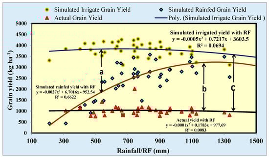 - Bhatia, V.S.; Singh, P.; Wani, S.P.; Chauhan, G.S.; Rao, A.V.R.K.; Mishra, A.K.; Srinivas, K. Analysis of Potential Yields and Yield Gaps of Rainfed Soybean in India Using CROPGRO-Soybean Model. Agric. For. Meteorol. 2008, 148, 1252–1265. [Google Scholar] [CrossRef]