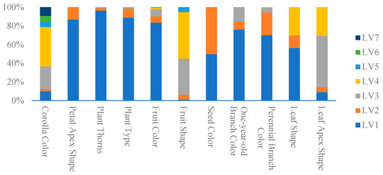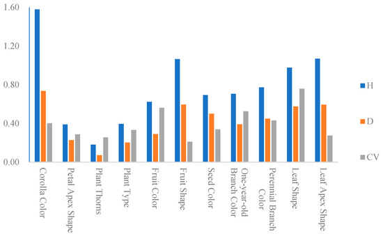 The CVs for the 11 pseudo-qualitative traits ranged from 21.15% to 75.82%. Acute leaf shape (75.82%), fruit color (56.15%), and color of one-year-old branches (52.51%) had relatively high CVs, each exceeding 50%, indicating poor stability among individuals. Conversely, fruit shape (21.15%), thorn density (25.71%), acute leaf apex shape (27.51%), and petal apex shape (28.76%) had lower CVs, all below 30%, indicating higher stability among Lycium ruthenicum individuals. The ranges of H and D for the 11 pseudo-qualitative traits were 0.18 to 1.58 and 0.07 to 0.74, respectively (Figure 2).