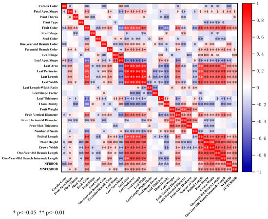 Correlation analysis of 31 phenotypic traits. NFBBOB stands for Number of Fruit-Bearing Branches on One-Year-Old Branches, and MNFCSBOB stands for Maximum Number of Flowers in Clusters on Short Branches of One-Year-Old Branches.