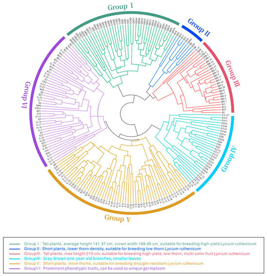 Cluster analysis based on phenotypic traits can reflect similarities and phylogenetic relationships among individuals. Using the absolute values of the feature vectors from the 10 principal components, Q-type clustering was performed on 19 selected indicators from the 31 traits. The results (Figure 4) show that the 213 Lycium ruthenicum samples were clustered into six groups.