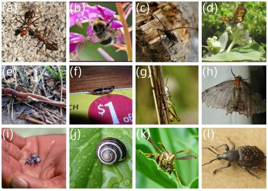 Image samples from the dataset: (a) ants; (b) bee; (c) beetle; (d) caterpillar; (e) earthworm; (f) earwig; (g) grasshopper; (h) moth; (i) slug; (j) snail; (k) wasp; (l) weevil.