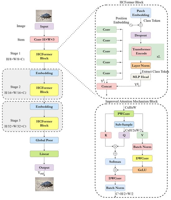 A novel pest object detection network is proposed in this paper that combines CNN and ViT, incorporating lightweight strategies to balance detection accuracy and testing time. The basic architecture of our HCFormer model employs a Stem module in its initial stage. This module consists of a set of standard convolutional networks, converting the input image into feature maps instead of converting linear mappings of image patches into tokens as in transformers. The feature extraction section is divided into three stages, adopting a pyramid structure. Each stage progressively reduces the resolution of the feature maps, with sizes of H/8 × W/8, H/16 × W/16, and H/32 × W/32, respectively.