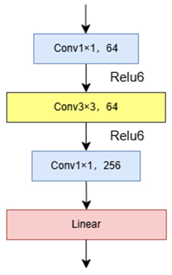 ReLU6 is used as the activation function for the first two stages, and a linear layer is utilized for the final stage; ReLU6 effectively maintains the resolution of floating-point numbers, enhancing the model’s nonlinear expression capability and transforming input features into:
