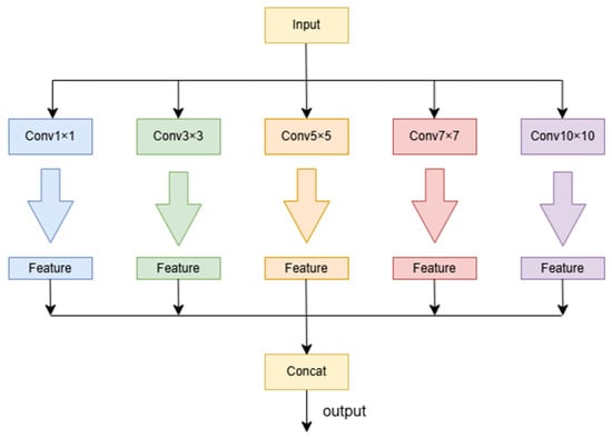 As illustrated in Figure 5, the preprocessed image features are fed into a parallel network structure, consisting of local and global feature extraction networks. The local feature extraction network employs a multi-scale array of convolution kernels sized 1 × 1, 3 × 3, 5 × 5, 7 × 7, and 10 × 10 to capture local features at different scales. The convolution operation is as follows: