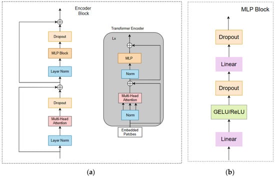 The ViT processes the sequence of encoded image patches using a standard transformer encoder. As shown in Figure 6a, the transformer encoder consists of four components: a Layer Norm network, a Multi-Head Attention mechanism, a Dropout layer, and an MLP block. The Layer Norm network increases the training speed and enhances training stability, Multi-Head Attention focuses on information representations in different subspaces, and Dropout is implemented as DropPath for improved effectiveness in practice. The MLP block, depicted in Figure 6b, includes fully connected layers, a GELU activation function, and Dropout, processing and outputting the results.