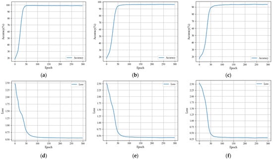 Figure 8a,d shows that by epoch 100, both accuracy and loss have largely stabilized, maintaining nearly constant values. This indicates that our model can converge quickly, with the loss approaching zero and the accuracy exceeding 98.7%. Thus, the completed model training demonstrates the superior performance of our proposed model.