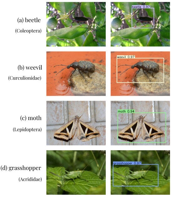 However, it is extremely challenging to accurately distinguish these pests with the naked eye. Some pest species may appear very similar, especially in their larval or adult stages, and subtle morphological differences often require a microscope or expert biological knowledge to identify them [,]. For instance, certain types of beetles and moths can be very close in color and size. Additionally, environmental factors such as lighting and background also affect the identification of pests [,,]. More challengingly, these pests often move quickly or hide in natural environments, making it difficult for even experienced agricultural workers and researchers to effectively monitor and manage them. The traditional methods of visually inspecting and evaluating crops solely based on farmer expertise present several challenges and limitations in agricultural research []. In the worst-case scenario, an undetected crop pest might damage the entire crop, negatively affecting the yield.